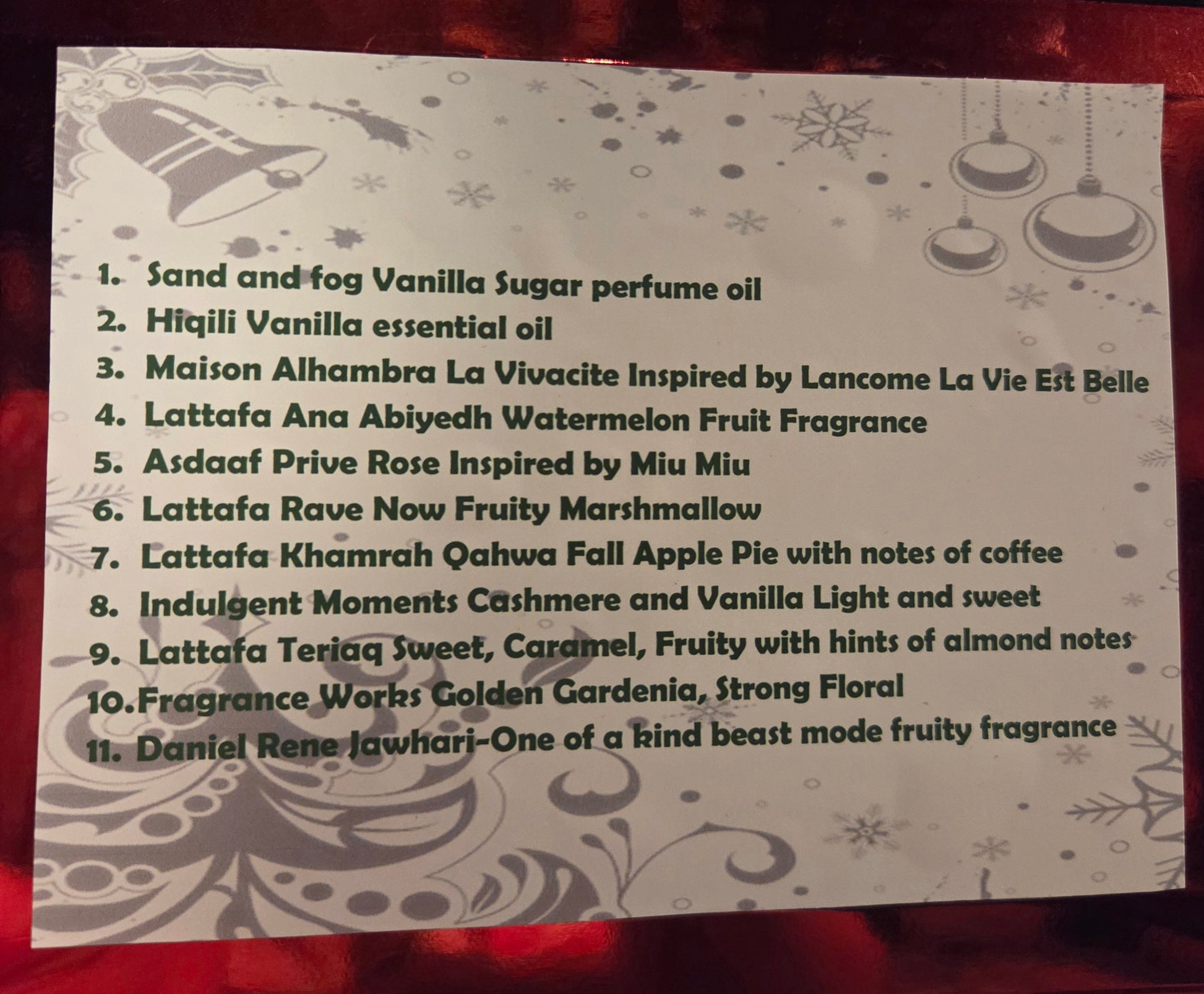 Discover the magic of scents with our 12 days of Christmas Fragrance Samples set! Featuring 10 unique perfumes with 2 ML spray samples and two 5 ML perfume oil, this is the perfect way to explore the world of fragrances. Ideal for both beginners and gifts for loved ones.