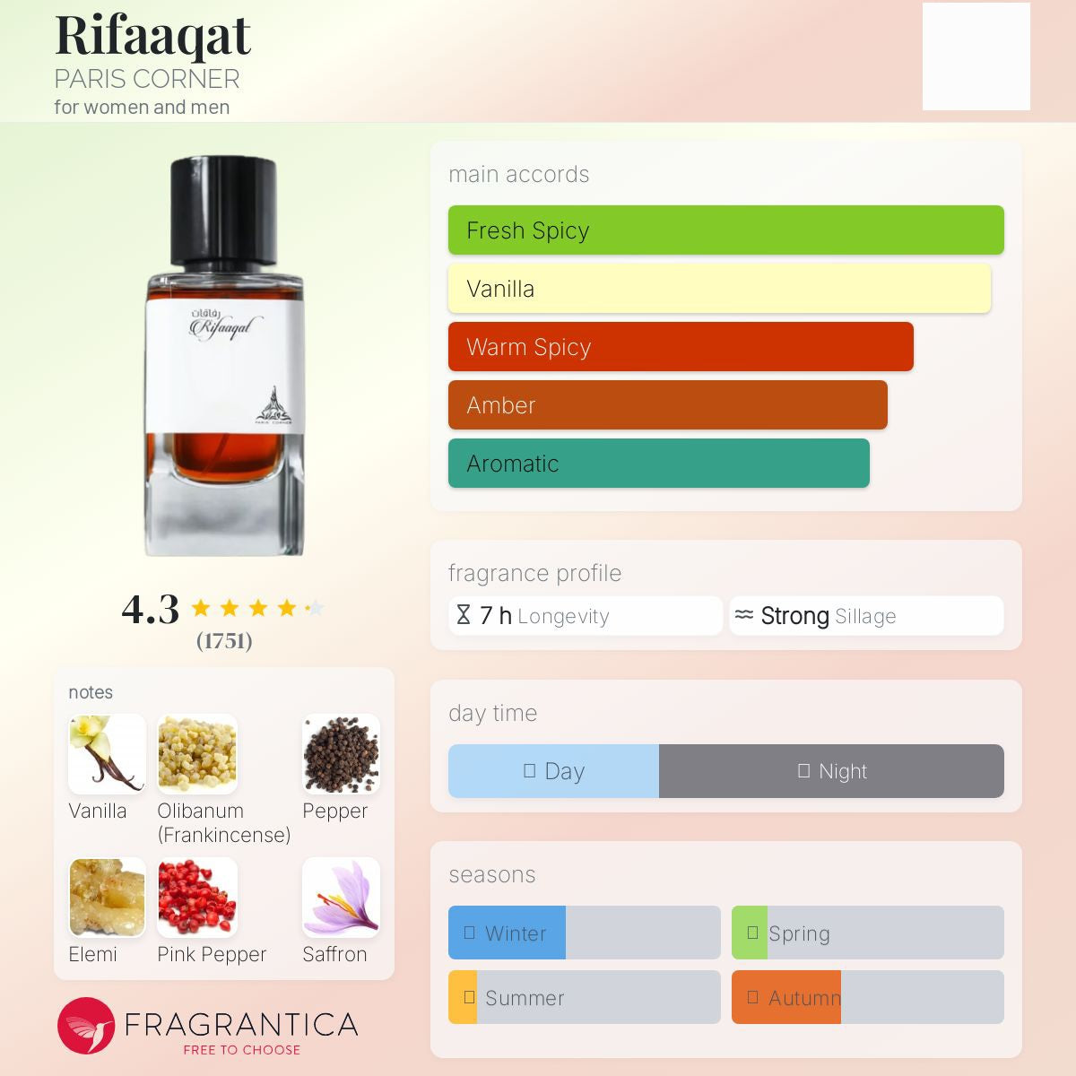Introducing Paris Corner Rifaaqat, a warm and spicy vanilla fragrance perfect for cold weather. Its masculine-leaning scent will keep you feeling cozy and confident all day. Say goodbye to dull winter days with this unique and playful scent.